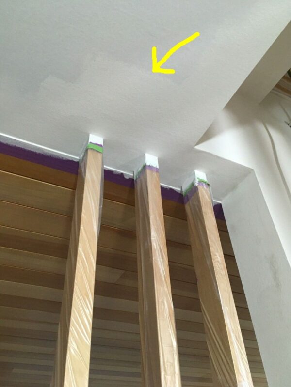 フェザーフィール塗装中のひとコマ。黄色い矢印の先が少し濃く見えるのは、この部分が二度塗り目に入っているためです。