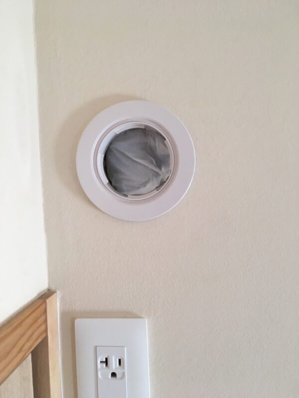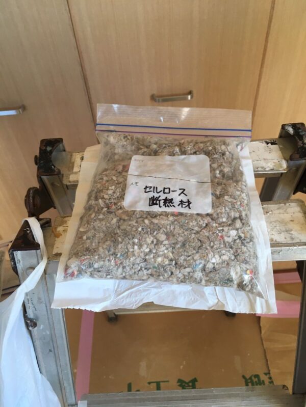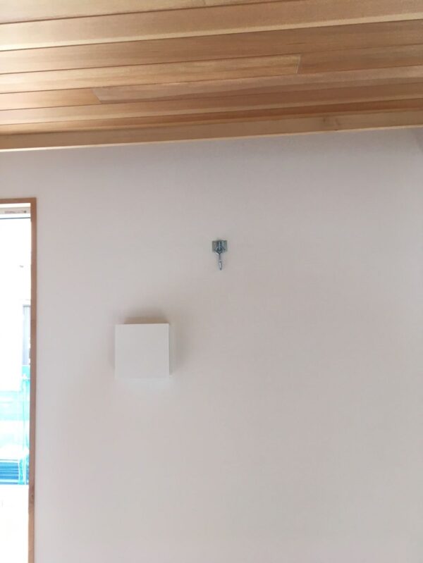 穴の中に入れているのがこちら。袋詰めにしたセルロースファイバーです。エアコンを取り付けるまでの間とはいえ、内部がスカスカの配管穴は断熱性能を大きく損なうので、何か対策できないかと考え、辿り着いたのがこの方法です。本当は袋に入れず、ギュギュっと詰め込みたいところですが、そうするとエアコン設置時の作業が大変になるので、今回は、袋詰め方式を採用しました。十分とは言えないですが、何も入れないよりは、かなりましになると思います。