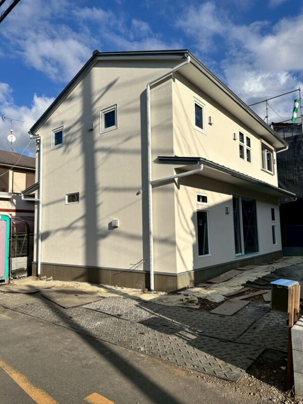 最後に、外壁工事が終わり、足場が外れた T 様邸の外観写真を載せておきます。総二階建ての、すっきりとした印象の外観です。完成まで、あともう少しです。