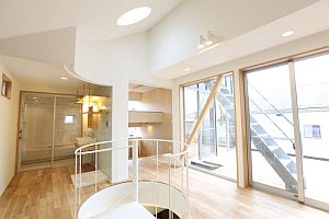 吹き抜けから明るい陽射しが入る家