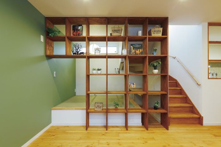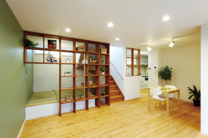 家族が自然に集まる心地よいリビング中心の暮らしをカタチにしたプランです。リビングのアクセントとなる飾り棚で仕切った畳コーナーは子どもたちの秘密基地&宿題コーナー。コミュニケーションの取りやすいリビング階段。みんなで挑戦した壁の塗装も「楽しく、思い出深い家づくりができました」とご満足いただきました。