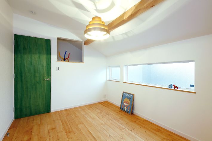 2階の子ども部屋のドアはグリーンで塗装して爽やかに。将来は2部屋に仕切れる設計です