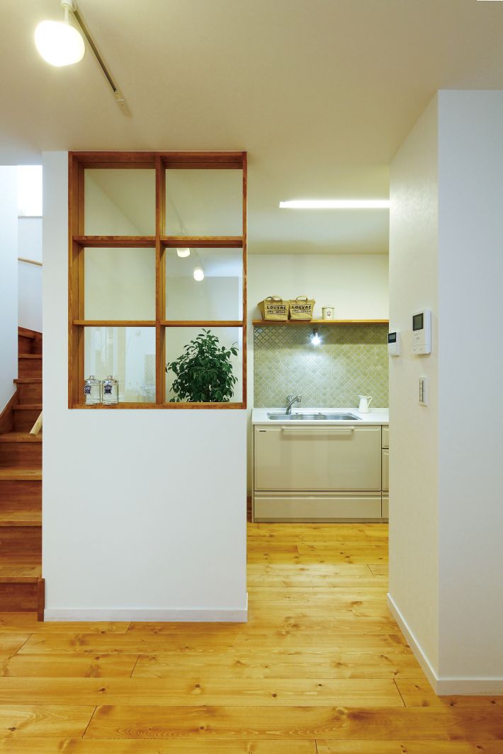キッチンとリビングを仕切る格子窓は奥様のセレクト。ガラスの美しい納め方などは造作ならでは
