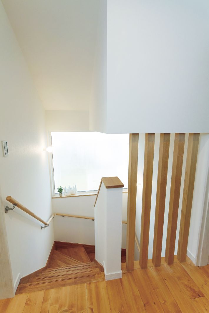 階段の真ん中には採光性の高い大窓を配置。格子の仕切りを通して、2階にも明かりを届けます