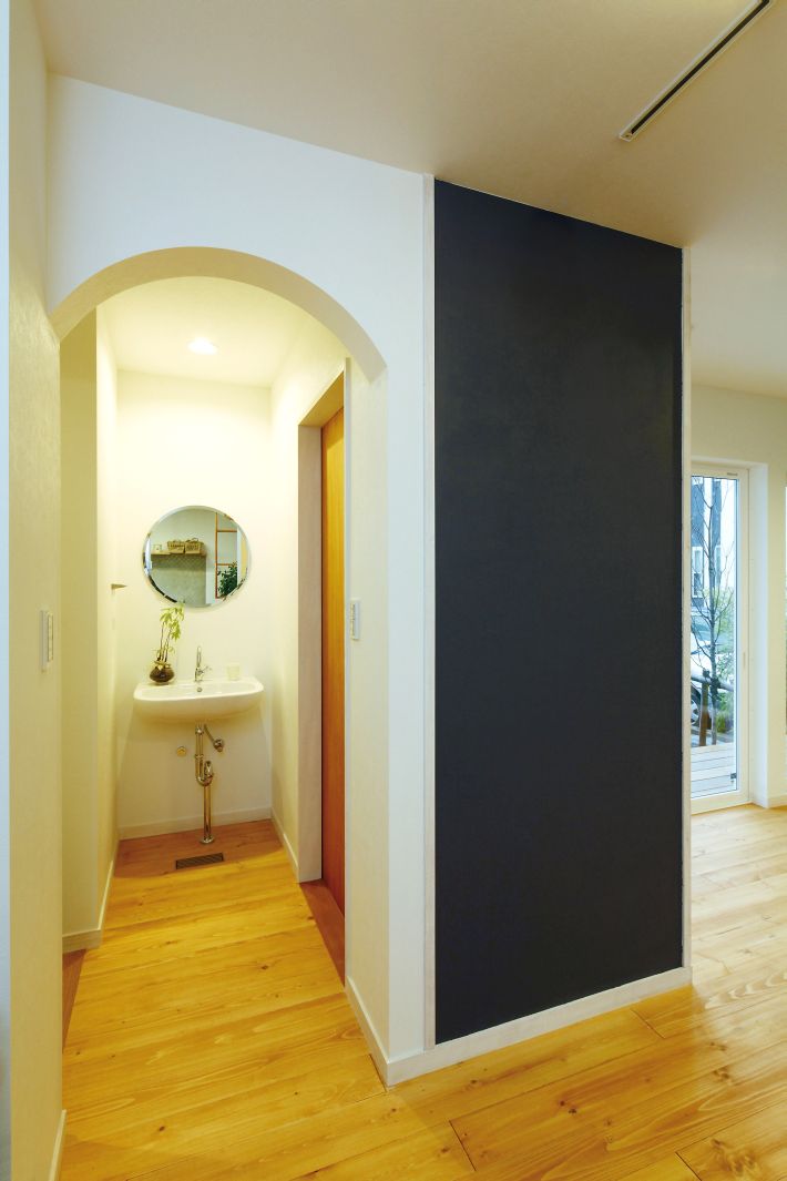 リビングの一角にある手洗いコーナーの入り口には、ご家族みんなで塗ったマグネット塗装の壁