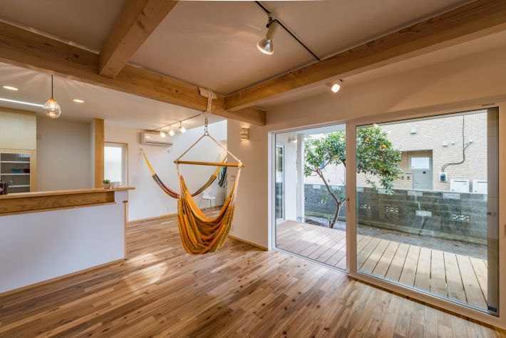 1階リビング。明るく風通しの良い場所に取り付けられたハンモックは、抜群のリラックススペースです