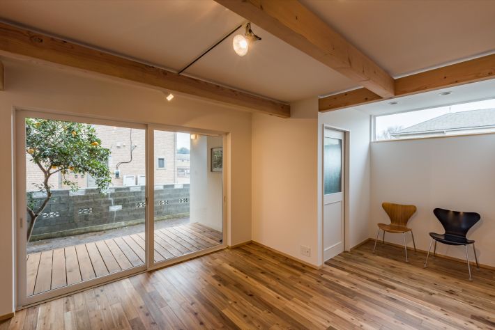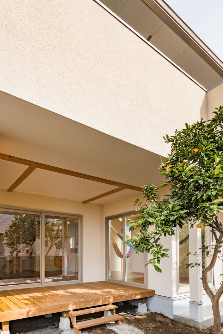 ミカンの木のある庭を眺めながらゆったりと過ごしたり、子どもの遊び場になったり、豊かな時間を過ごす場所