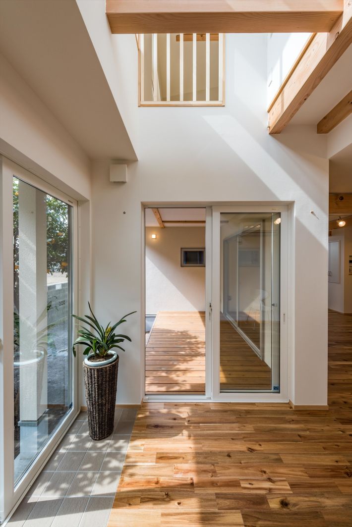プライバシーを考慮し、道路に面している北側は窓を少なく、中に入ると大きな窓や吹き抜け、ウッドデッキで開放的な空間が広がります