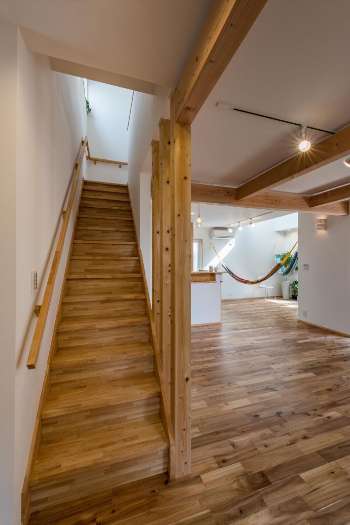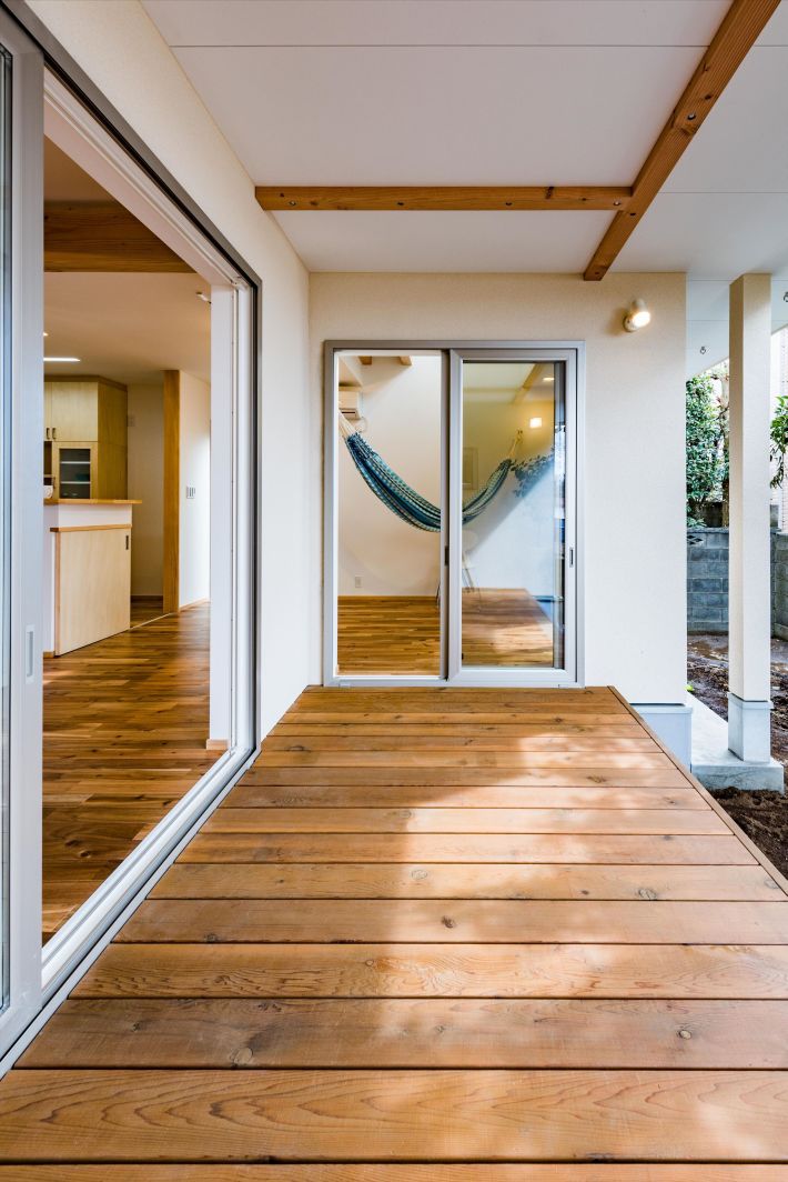 ハンモック関連のお仕事をされているご夫婦とお子さんの3人家族が暮らす、光と風に満ちた家。ハンモックの設置はもちろん、音楽が趣味のご主人には防音室を、奥様にはリビングにいても集中して仕事ができるよう、部屋の中に部屋を。遊び心たっぷりの家ができました。