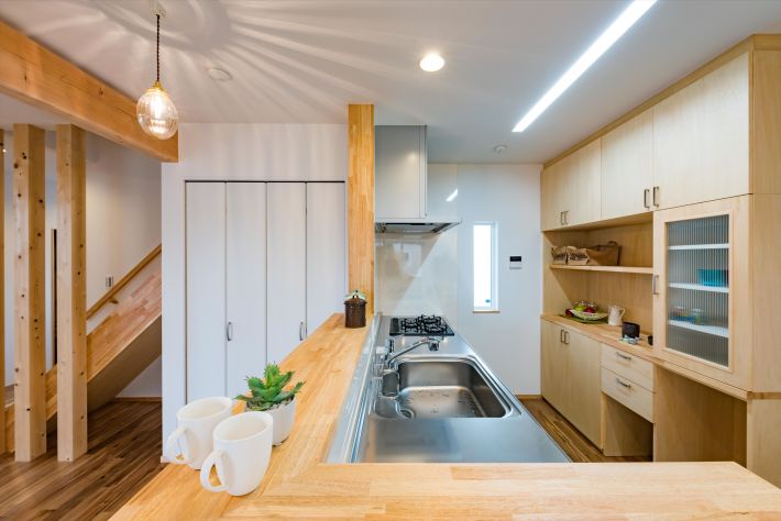 キッチンの壁全面に収納家具を造り付け、いつでもキレイを実践中