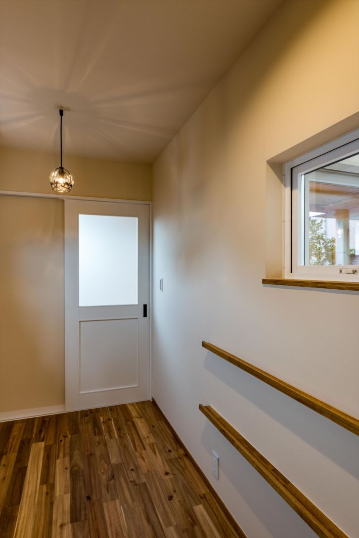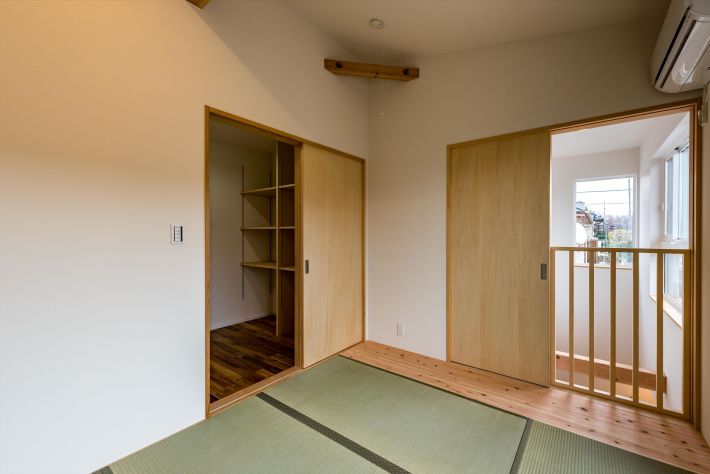 吹き抜けに面した明るい2階の寝室。開口部は引き戸で開閉。使い勝手のいい収納コーナーも喜ばれています