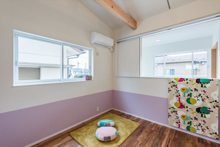 2階の子ども部屋。腰の高さのアクセントクロスは、重心が下がり空間が広く見える効果もあります