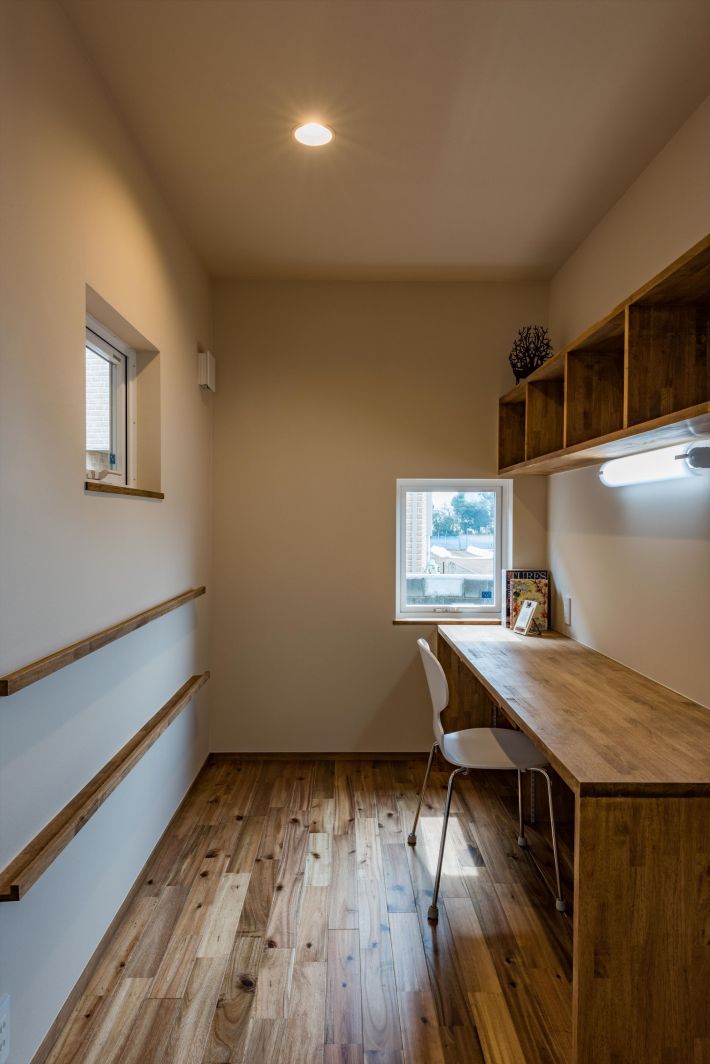 リビングの一角にある部屋の中の部屋は奥様の仕事場。小窓からは遠くの景色が望めるので、狭くても圧迫感がありません