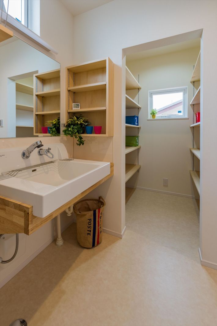 洗面脱衣室の隣には、大容量収納可能なリネン庫を配置しました