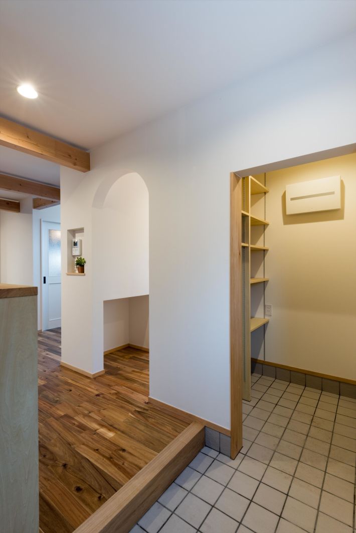 正面が玄関、左のアールの壁の奥は手洗いコーナー&トイレ、右の白い扉は階段下を活用した収納スペースになっています