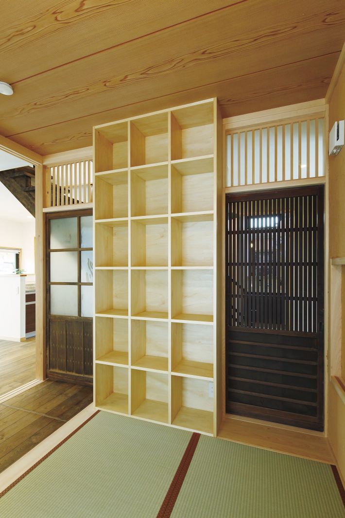 ご主人が集めたアンティークな建具の寸法に合わせてぴったりに施工。和室は書斎として使うとのことなので本棚も造作しました