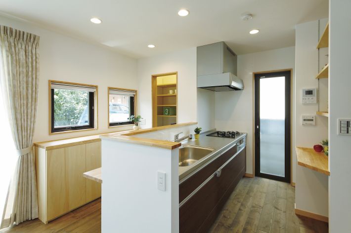 借景を楽しみながらお料理ができる、窓に向いたキッチン。中央奥の食品庫やカウンターなど収納も充実