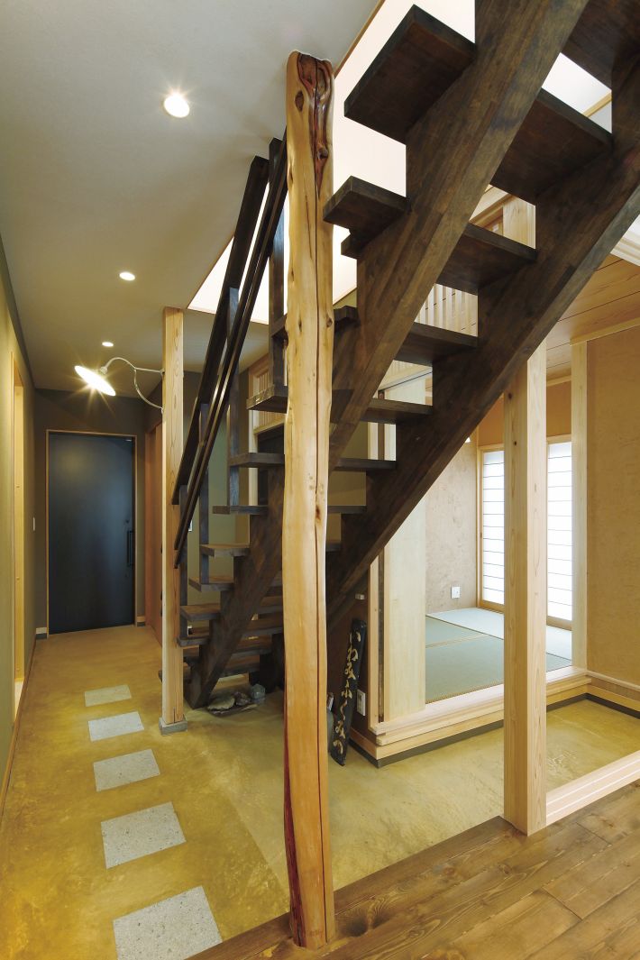 「心の故郷、山陰の古い港町の風情が漂う場所で暮らすのが夢」とおっしゃっていたご主人の夢を叶えるため、暮らしの中にその情景を彷彿させるような空間を作りました。玄関からリビングへの通り土間には古い建具を施し、時間が遡ったかのような雰囲気を醸し出しています。