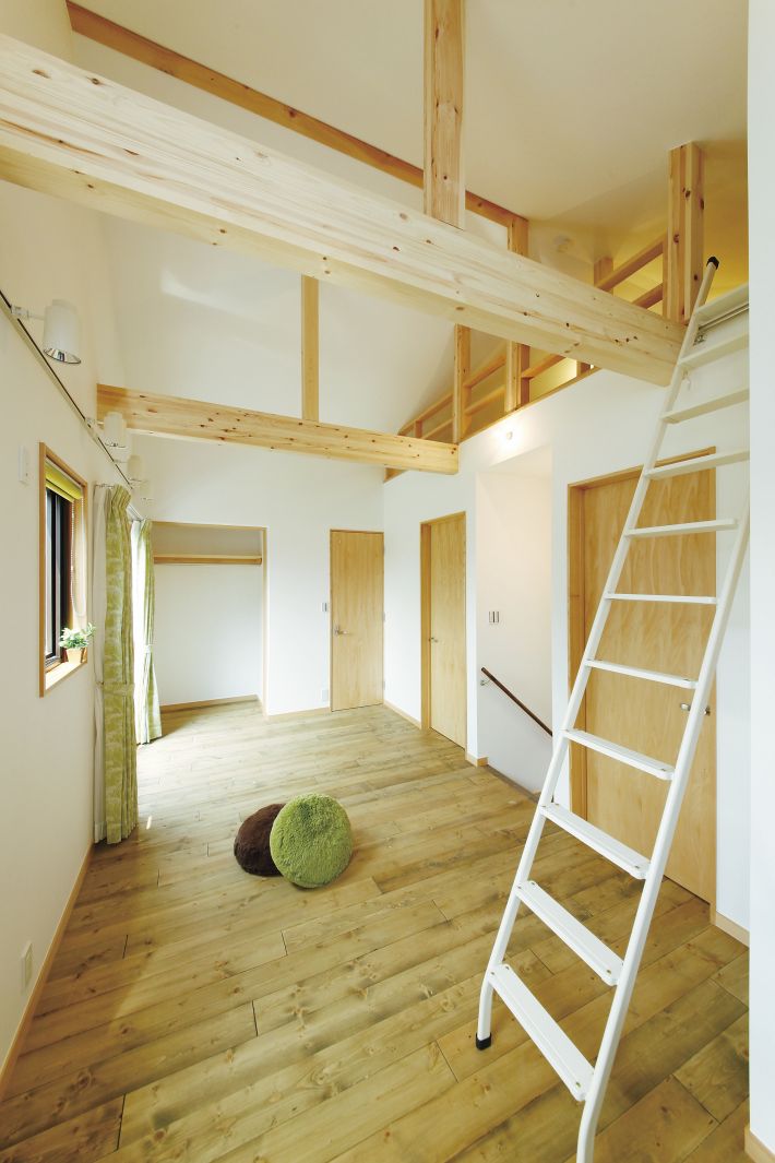 2階のフリースペースは、もっぱら子ども室兼家事室。手前の白い階段の上はロフトになっています