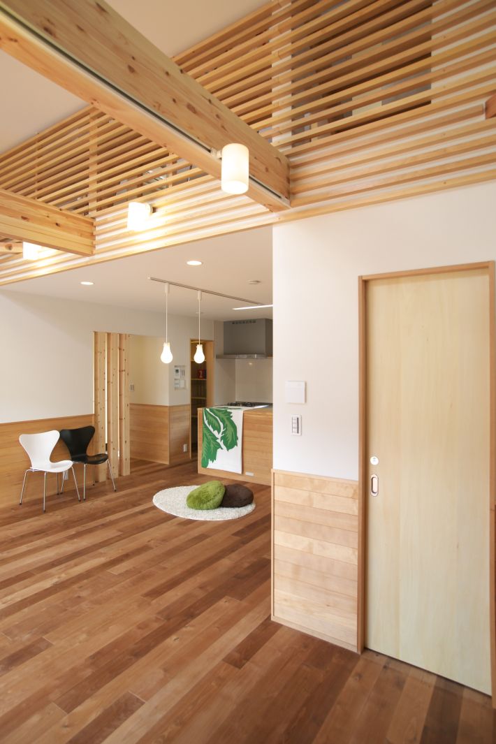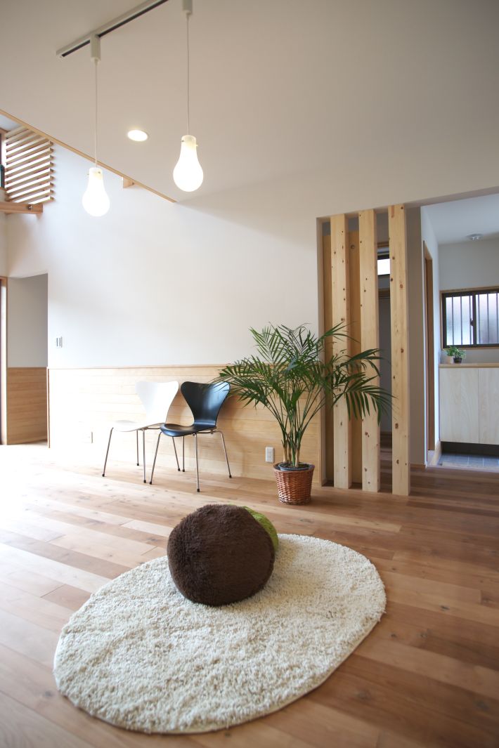 パインの梁が美しい吹き抜けのリビング。奥は造作のカウンター収納、左はトイレスペース