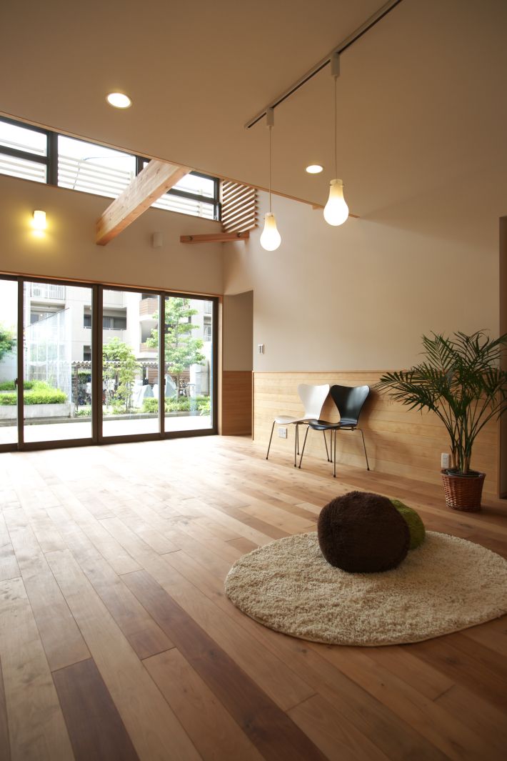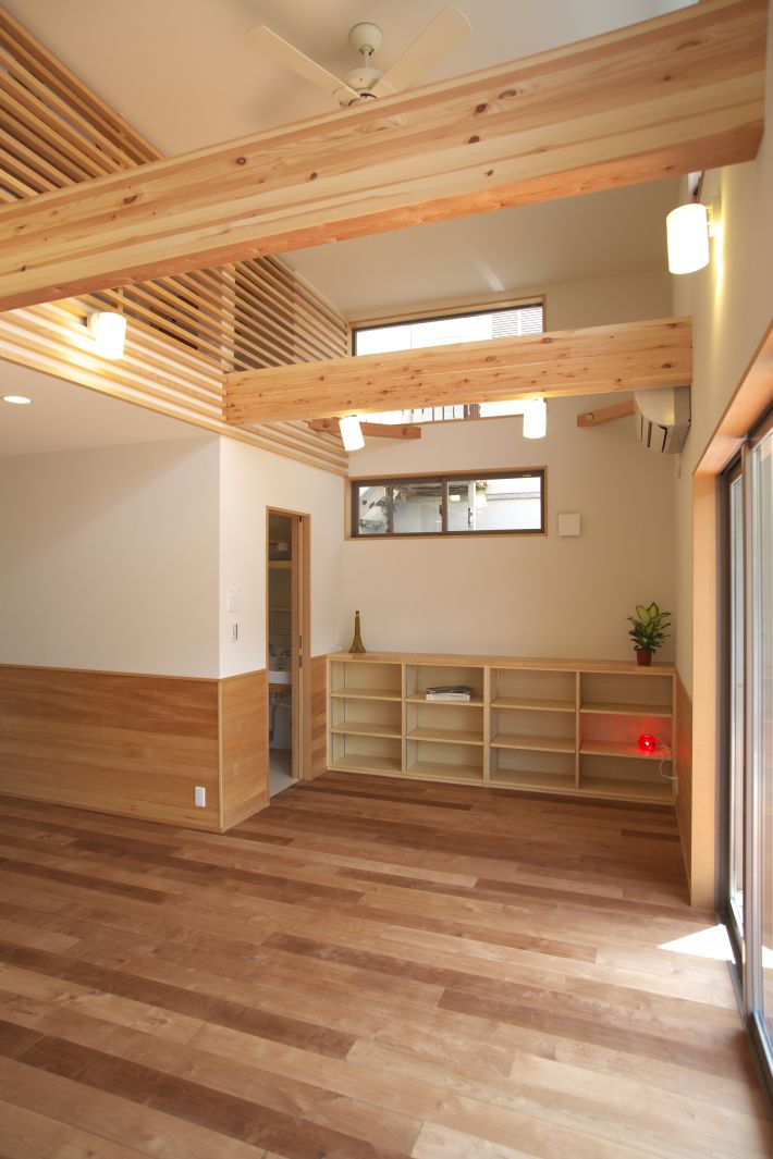 「エアコンをあまり使いたくないので、そのぶん風通しのいい家にしたい」というオーダーでした。もともと風通しのいい立地だったので、リビングの高窓から風を入れ、吹き抜けに面した2階の格子を通り、そのまま寝室に入るよう設計しました。