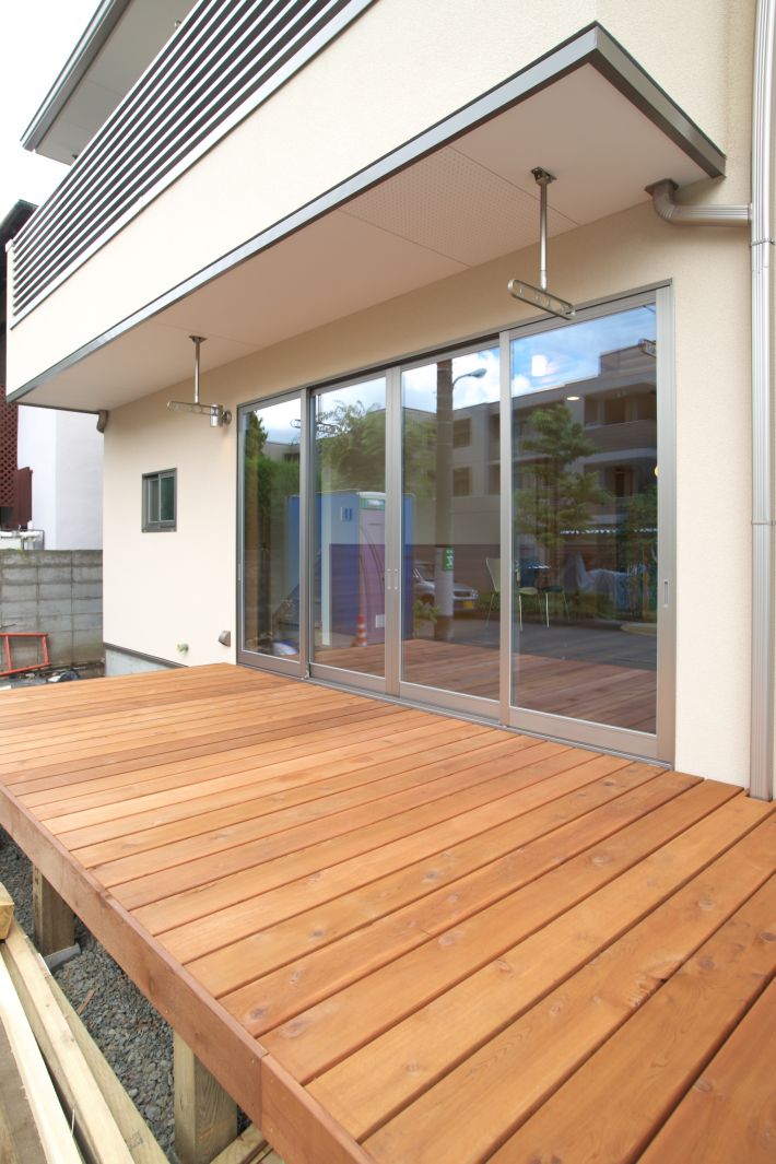 リビングから続くウッドデッキ。腰かけた目線の先には、手入れされた庭が広がります
