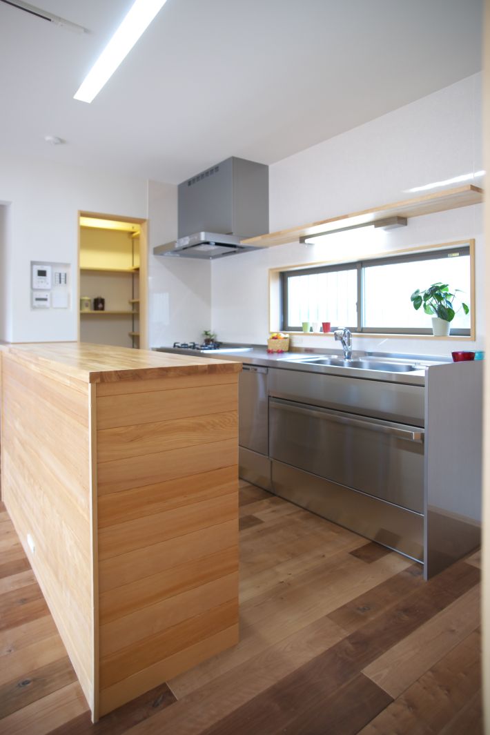スタイリッシュなステンレスキッチンの向かい側には家事カウンターを造作
