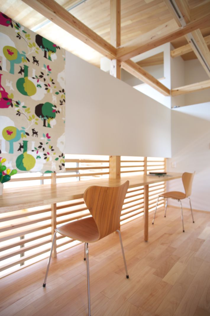 吹き抜けに面した2階の廊下には、カウンターテーブルを造り付けました