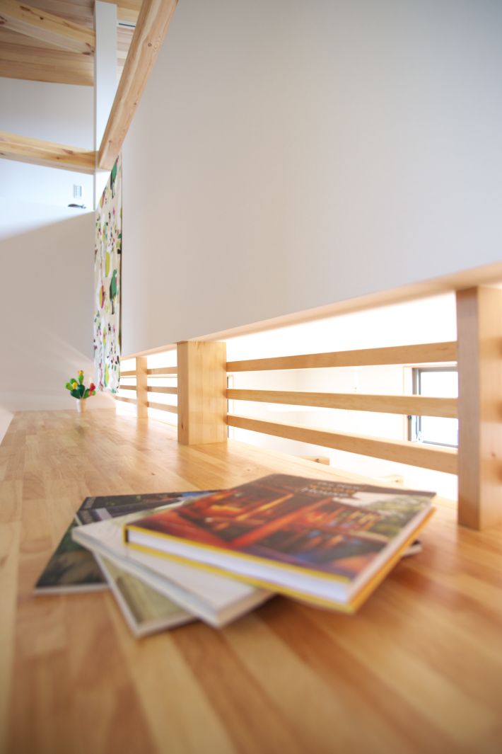 リビングの吹き抜けに面した2階部分には、デザイン性の高い横格子の腰壁を設置しました
