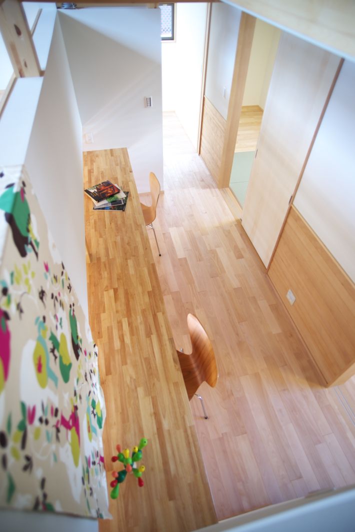 ロフトから2階を見渡した様子。カウンターテーブルの後ろはご夫婦の寝室。この部屋まで涼しい風が届きます