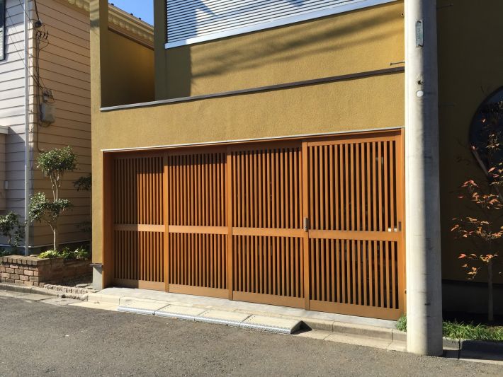 からし色の壁が目をひく和テイストの外観。左の格子戸がビルトインバイクガレージ、右壁の開口部が玄関です