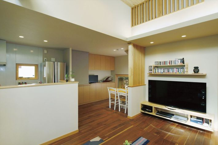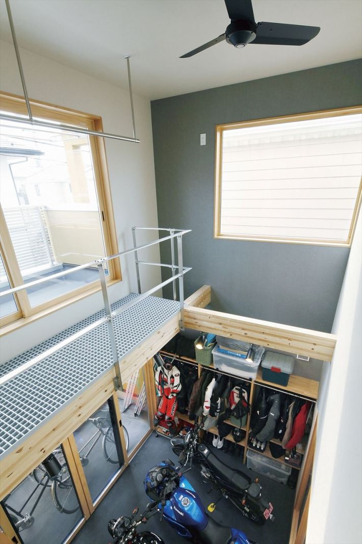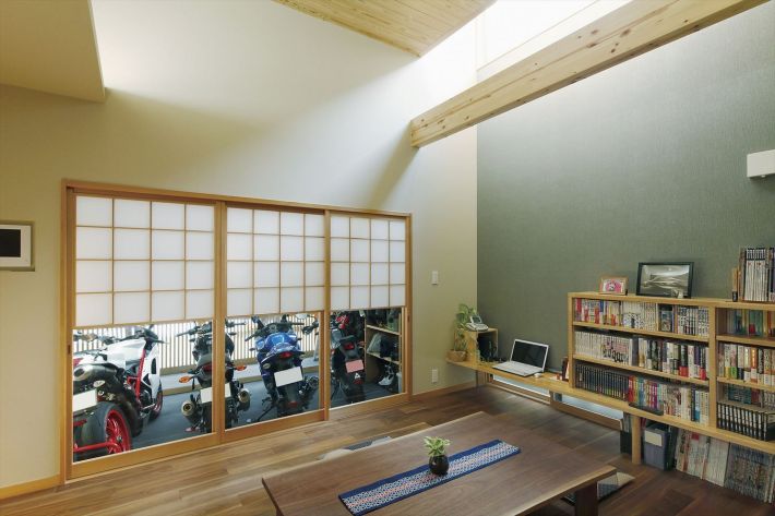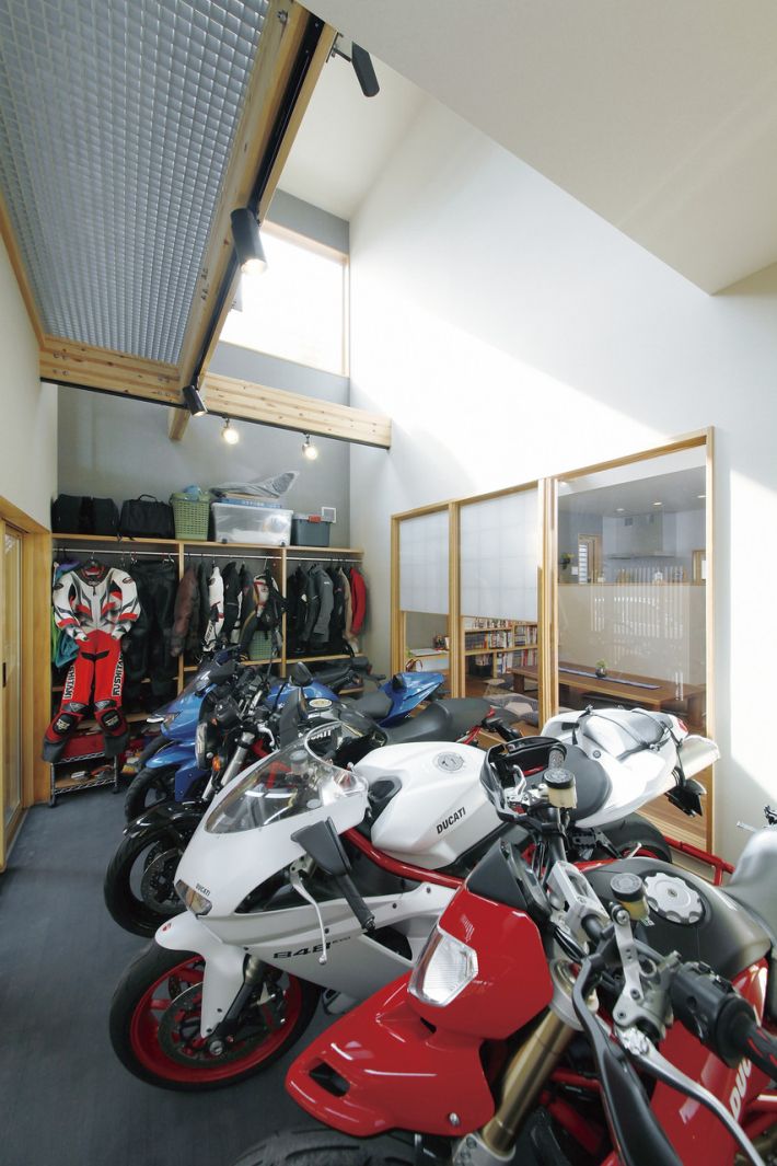 バイクが大好きなご家族の夢は、全5台のバイクが置けるビルトインガレージ。ガレージの上を吹き抜けにして、1階のリビングからも2階の吹き抜けに面した各部屋からも愛車を眺められるよう計画しました。ご希望だった和の空間もデザインに反映させています。