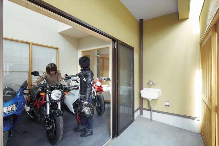 バイク5台とスーツやブーツ、ヘルメットもすっきり収まるビルトインガレージ
