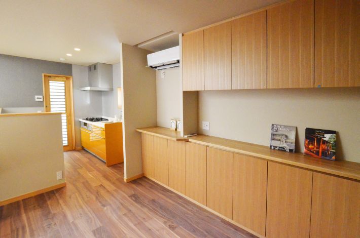 ダイニングテーブルから見える、ポップな色使いのキッチン。壁面には大型の収納も造り付けました