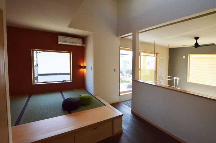2階の寝室には畳の小上がりを。右サイドは吹き抜けに面しているので、ガレージが一望できます