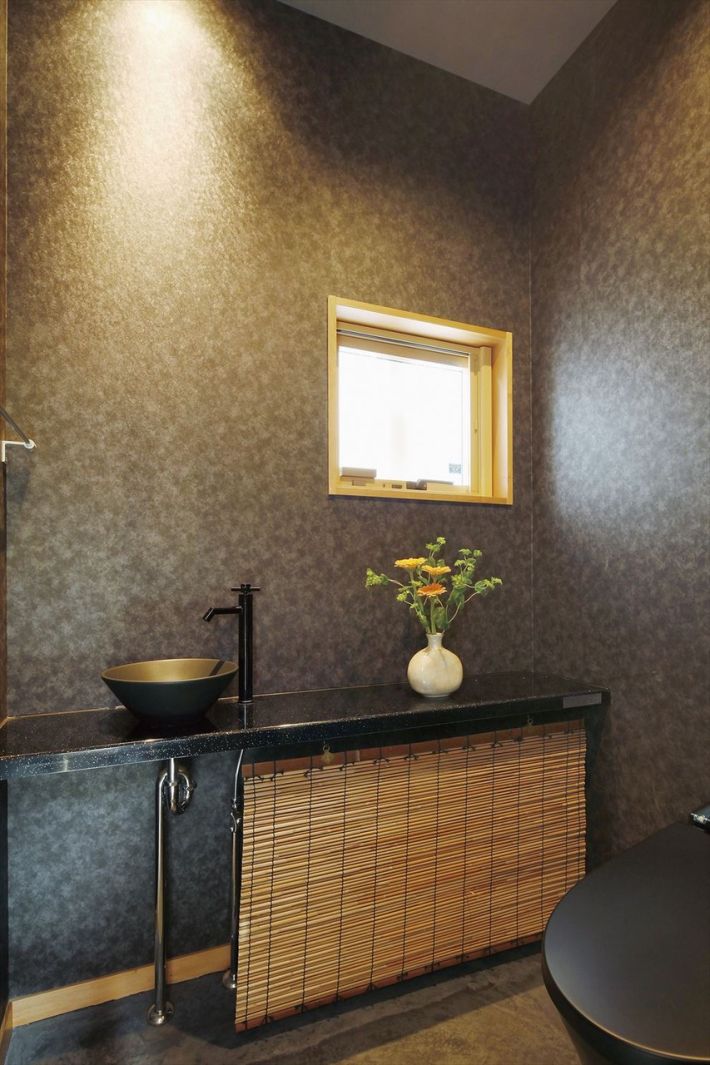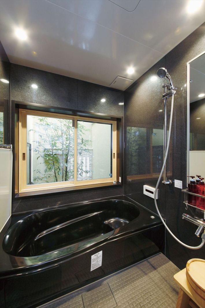 木製の窓枠に竹のグリーンが映える和モダンなバスルーム