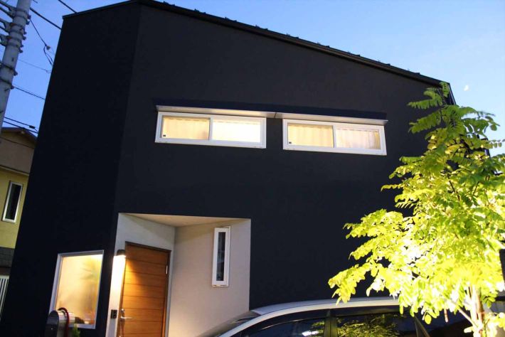 夕暮れのライトアップが美しい玄関側の外観