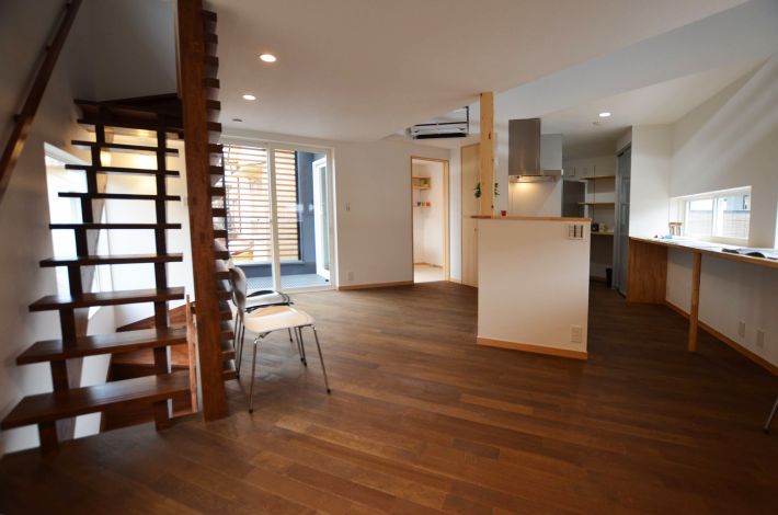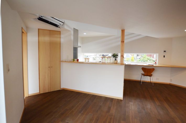 キッチンカウンターの後ろには、窓辺に沿った長いカウンターテーブルを設置。お子さんの勉強スペースやご家族のパソコンコーナーとして重宝します