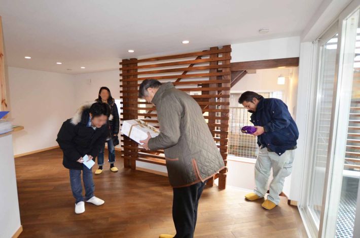 リビングにて、感動のお引き渡し。小野寺社長からは恒例の記念品贈呈
