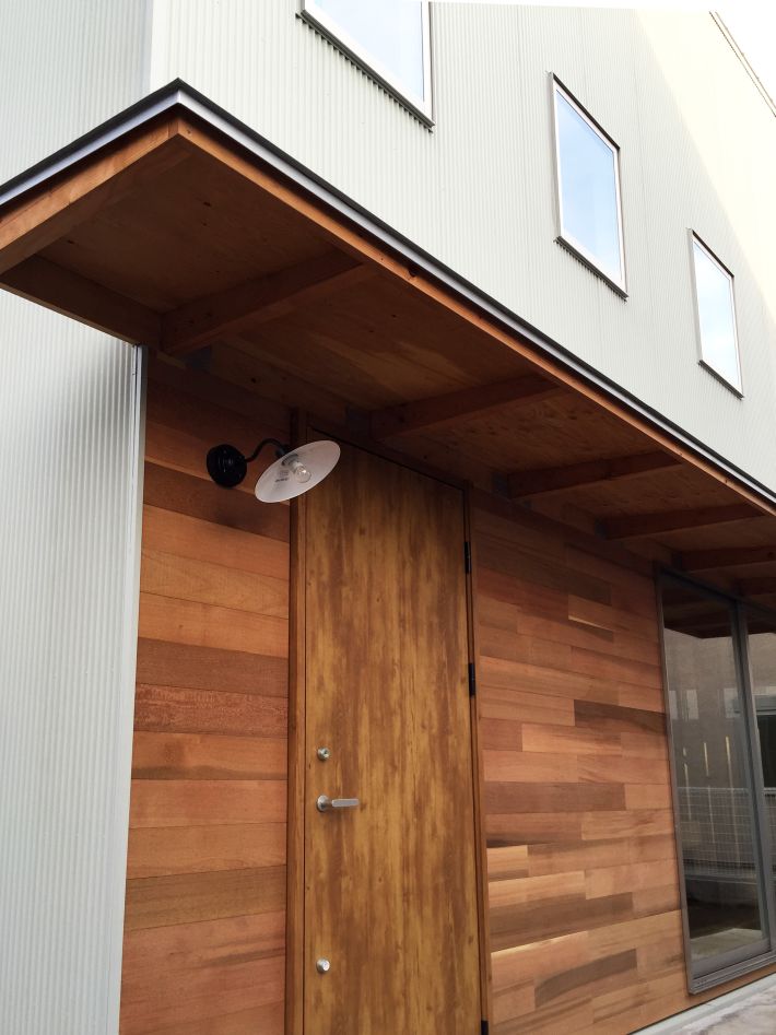 ウエスタンレッドシダーの板張り、建物の横に飛び出している横長な庇が個性的な玄関