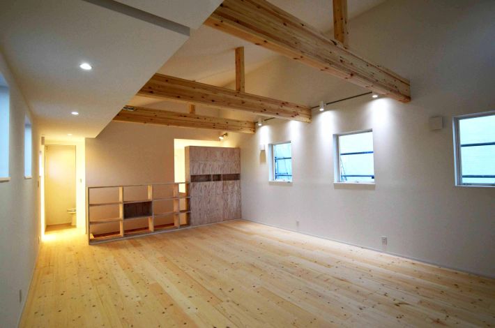 2階の大空間は子ども室。将来、梁の下で部屋を3つに仕切れるように、窓やコンセントは3か所に取り付けています
