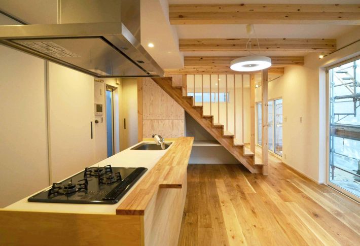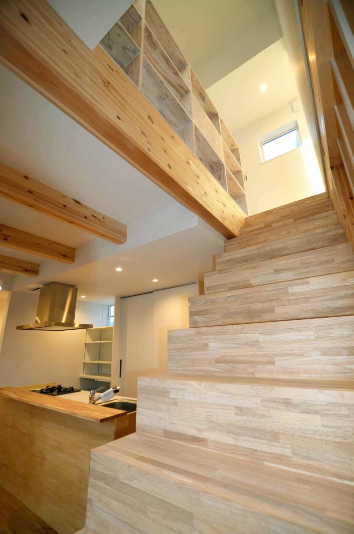 階段から見たキッチン。家のどこにいても家族がつながっていられる、風通しのいい住まいです