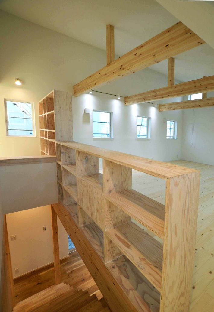 子ども室と階段の境に棚を造り付けました