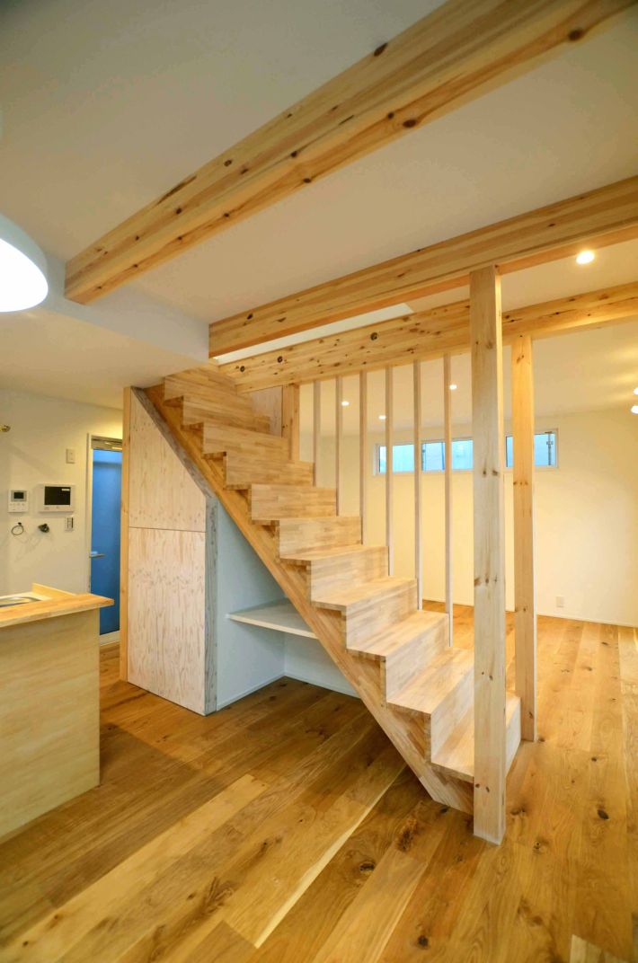 部屋の真ん中に配置したオープンな階段は、リビングとダイニングの間仕切りも兼ねています。階段下は収納コーナー
