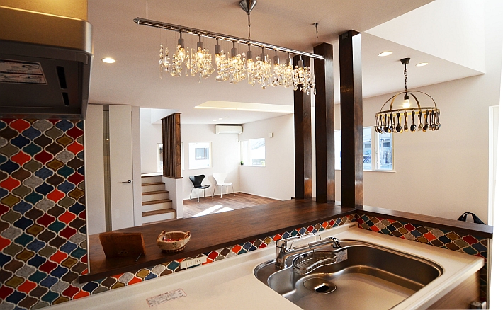 K様邸のLDK。キッチンの照明もダイニングの照明もご家族がヨーロッパに旅行された際に購入されたもの。キッチンのタイルは名古屋モザイクのコラベルタイル