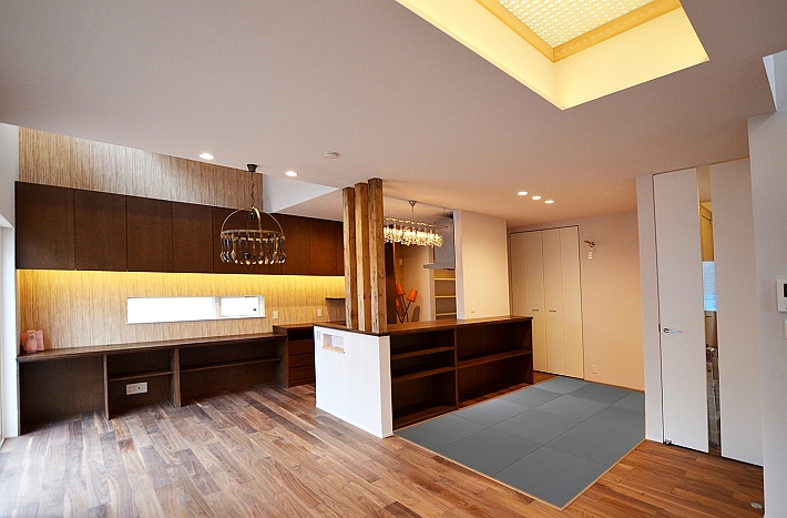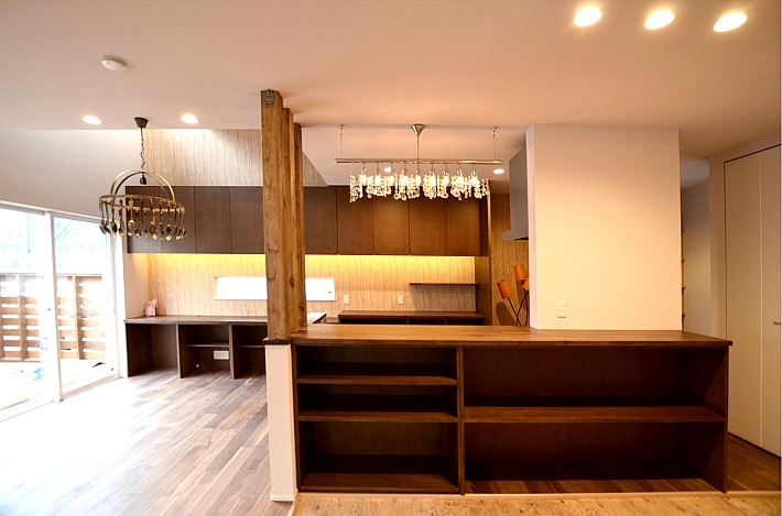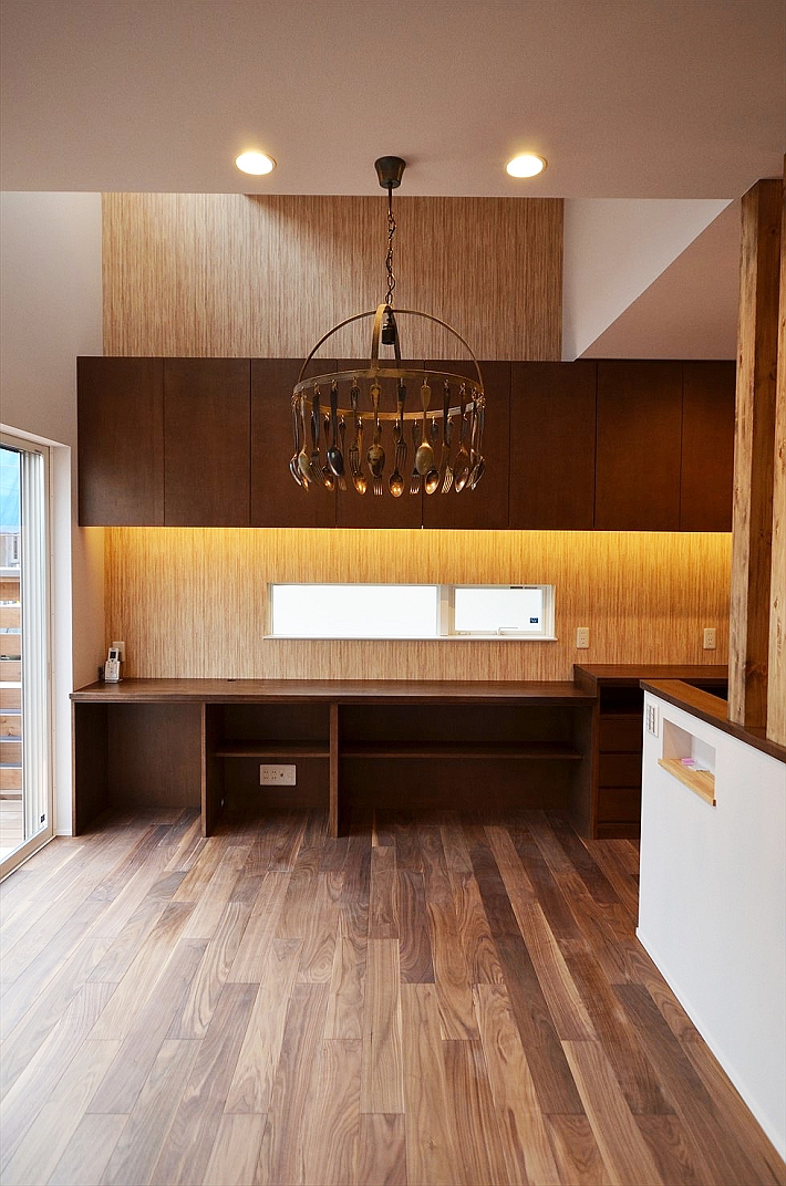 キッチン横の吹き抜けスペースにはインパクト大の照明器具を設置。床材は無垢のウォールナット