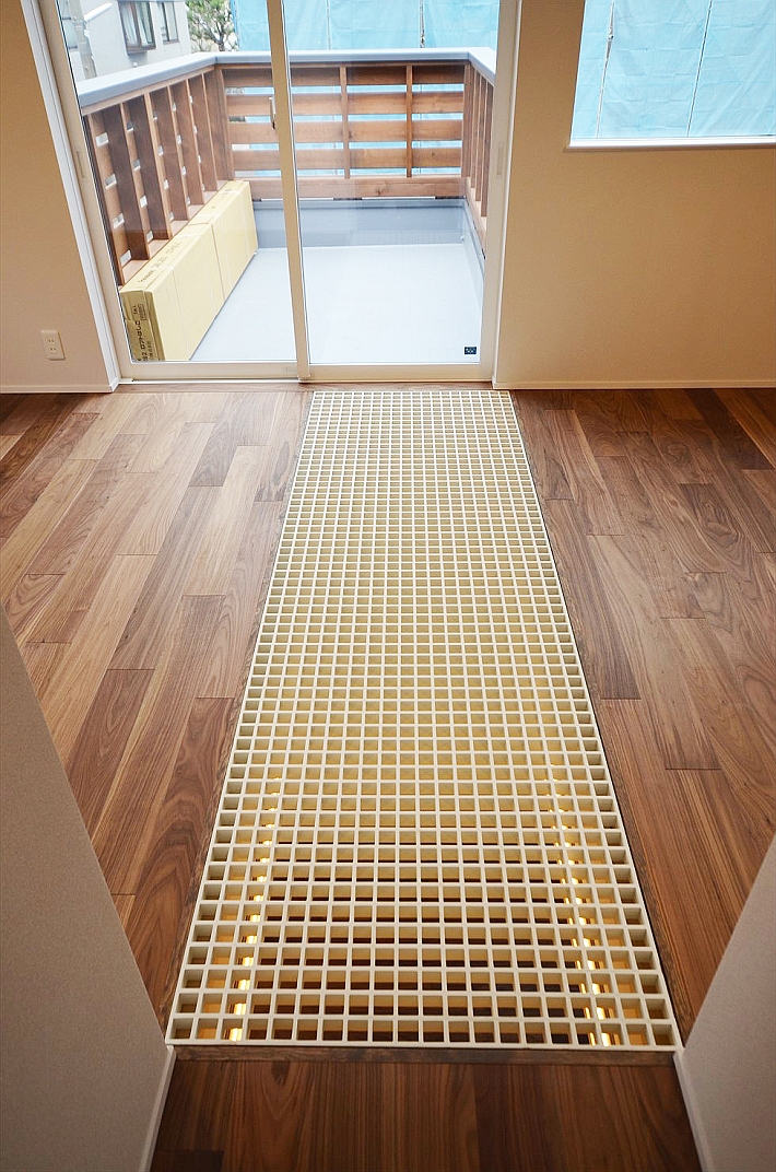 バルコニーの手前の床をグレーチングに。明るい日差しが下の階のリビングに差し込むように工夫しています