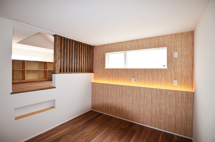 別角度から撮影したLDK。キッチンの横にはお勉強カウンターを造作