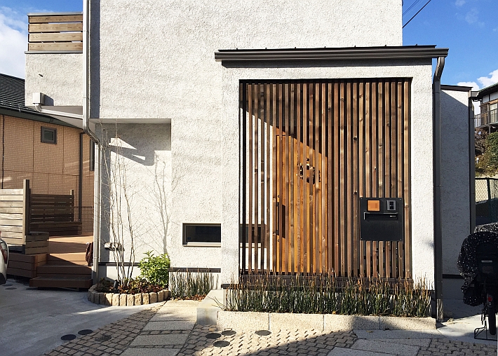 玄関の目隠しの桟はレッドシダーです。エコウッドトリートメントという塗料で塗装しています