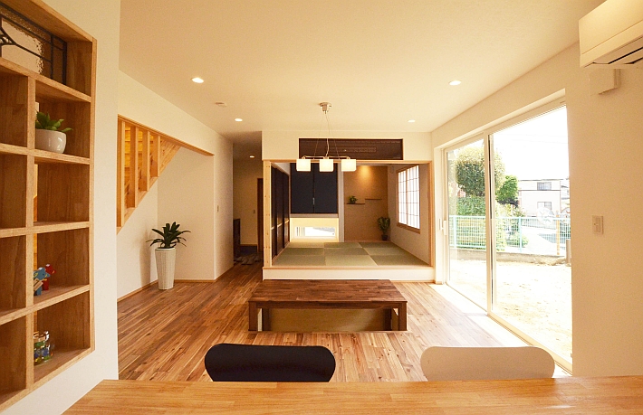 土地探しからお手伝いさせていただいたK様邸です。時代劇が好きなご主人の趣味にあわせて時代劇に出て来るような和室を作りました。和室で採用している建具はK様ご支給の古民具です。また通常のテーブルを使った堀り座卓は奥様のアイデアです。